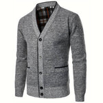 Cárdigan de hombre con cuello en V, botones, forro a cuadros y bolsillos laterales