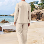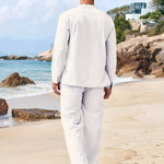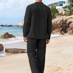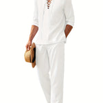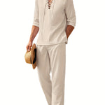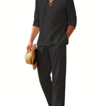 Este conjunto de dos piezas para hombre combina una camisa de manga larga con cordones y corte holgado con pantalones rectos a juego para un look informal y coordinado . Ideal para vacaciones , playa o para relajarse en climas cálidos, combina un encanto informal con una sofisticación refinada . Imprescindible para un estilo veraniego relajado .