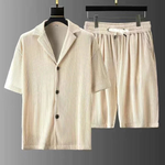 Este conjunto de dos piezas para hombre combina una camisa de manga corta con botones, cuello estructurado y textura acanalada para un look limpio y contemporáneo. Los pantalones cortos con cintura elástica y cierre de cordón garantizan comodidad y una silueta estilizada. Perfecto para salidas informales, para relajarse o para un estilo urbano diario .