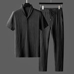Este conjunto de dos piezas para hombre incluye una camiseta estilo polo de manga corta y un pantalón holgado con cordón, diseñado para un uso diario informal . El cuello estructurado y las líneas limpias ofrecen un look refinado pero informal, ideal para viajes, para estar en casa o para salidas informales. Es un conjunto ideal para hombres que valoran la comodidad y el estilo moderno .