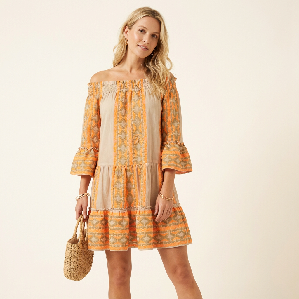 Este minivestido de mujer con hombros descubiertos luce un impresionante estampado étnico , perfecto para días de verano relajados o vacaciones en la playa. Con un corte holgado y detalles elásticos, ofrece estilo y comodidad. El diseño con hombros descubiertos y las mangas abullonadas le dan un toque chic y divertido a este vestido fresco.