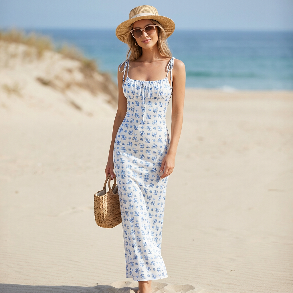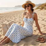 Mejora tu look veraniego con este vestido maxi floral para mujer con estampado de flores azules y tirantes ajustables. Diseñado con un clásico estampado de flores azules y tirantes ajustables , este vestido es perfecto para días de playa, fiestas de verano o salidas informales y combina elegancia, comodidad y un estilo atemporal en una prenda versátil.