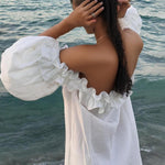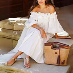 Este vestido largo con hombros descubiertos presenta un romántico ribete de volantes y voluminosas mangas abullonadas , lo que lo convierte en la opción perfecta para el verano . Su corte holgado y su silueta suave ofrecen libertad de movimiento, ideal para días de playa, salidas informales o escapadas de verano.