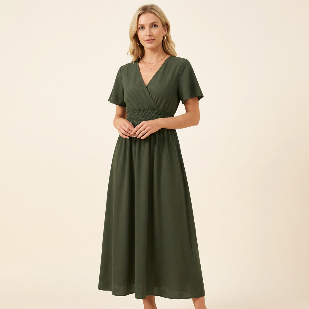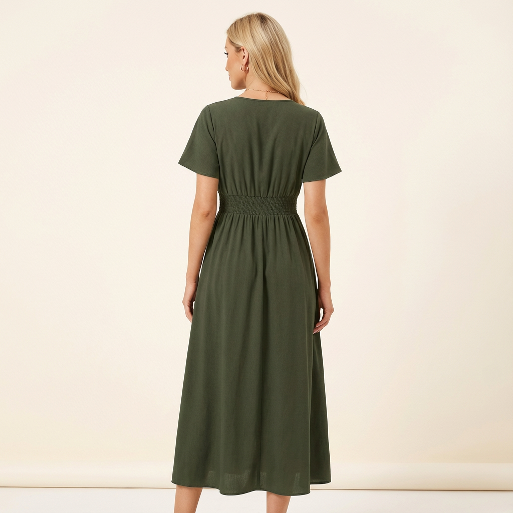 Luce un estilo y comodidad con el vestido largo para mujer con escote en V y cintura elástica . Con un favorecedor escote en V y una cómoda cintura elástica que realza tu figura, este vestido largo es perfecto para diversas ocasiones. Ya sea para una reunión informal o un evento especial, este vestido largo para mujer ofrece elegancia natural y comodidad durante todo el día.