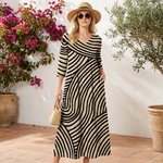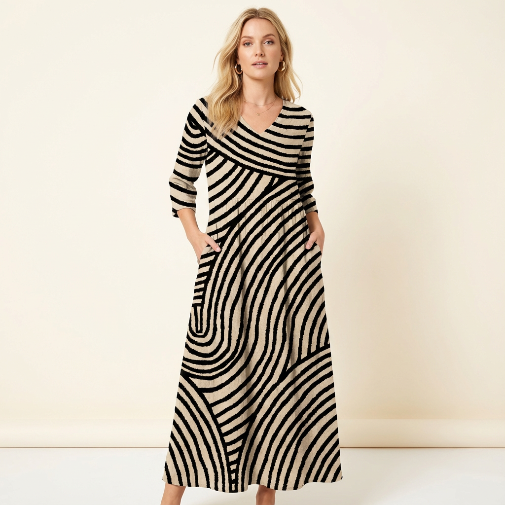Este vestido a rayas de inspiración vintage combina un estilo clásico con la comodidad moderna. Su tejido ligero y transpirable garantiza un uso duradero, mientras que el favorecedor escote en V y los prácticos bolsillos laterales aportan estilo y comodidad. Perfecto para días cálidos y versátil para cualquier ocasión.
