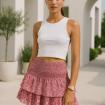 Esta minifalda estampada para mujer presenta una cómoda cinturilla fruncida , capas de volantes dobles y un diseño ligero y fluido, perfecto para días cálidos. Su llamativo estampado y su corte favorecedor la hacen ideal para salidas a la playa, brunchs informales o paseos de verano . Fácil de combinar con camisetas de tirantes, camisetas o tops cortos.