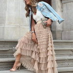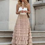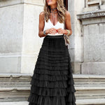Añade un toque de elegancia etérea a tu armario con esta falda maxi de tul con volantes escalonados para mujer . Con hermosos volantes escalonados de delicado tul , esta falda maxi crea un look romántico y de ensueño. Perfecta para ocasiones especiales o para añadir un toque caprichoso a tu estilo diario, esta falda es una prenda versátil y encantadora.