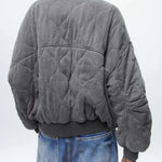Esta chaqueta bomber acolchada extragrande para mujer combina un estilo urbano impactante con comodidad para todo el día . Con un patrón de costuras onduladas, cierre de botones a presión y hombros caídos, ofrece calidez y un estilo informal. Ideal para combinar con looks casuales o deportivos en días fríos.