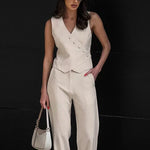 Este conjunto de dos piezas para mujer combina minimalismo y estructura para crear un conjunto elegante y moderno . El top sin mangas con cuello en V presenta botones llamativos y un corte impecable, y se combina con pantalones anchos de tiro alto para un look refinado. Ideal para eventos, cenas o para un look diario sofisticado.