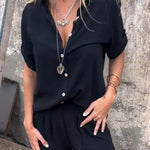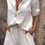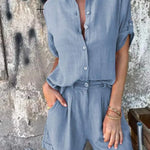 Acapara todas las miradas con este elegante conjunto de dos piezas para mujer: un top holgado abotonado y unos shorts casuales de cintura alta a juego. Diseñado para una elegancia relajada, las mangas remangadas y los detalles entallados le dan un look moderno y atemporal. Perfecto para brunchs, paseos de fin de semana o escapadas espontáneas.
