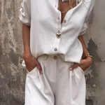 Estilo veraniego sin esfuerzo con un conjunto relajado de dos piezas con botones