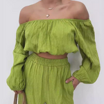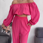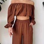 Este conjunto de dos piezas con hombros descubiertos para mujer presenta una textura arrugada con un top corto de manga larga y pantalones anchos a juego. Diseñado para una elegancia relajada , este conjunto coordinado es perfecto para vacaciones, eventos informales o salidas en días soleados. La cintura elástica y su suave caída lo hacen elegante y cómodo .