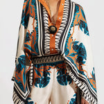 Este conjunto de dos piezas para mujer, compuesto por blusa kimono estampada y pantalón ancho, combina estampados atrevidos con una silueta kimono relajada y pantalones anchos y fluidos. Ideal para looks elegantes de día, para vacaciones o para ocasiones especiales, este conjunto ofrece un estilo excepcional con la máxima comodidad. Un conjunto que marcará tendencia y realzará tu armario con facilidad.