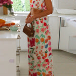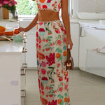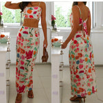 Este vibrante conjunto de dos piezas para mujer incluye un top corto ajustado con tirantes finos ajustables y una falda larga de cintura alta a juego . El divertido estampado de frutas le aporta encanto y personalidad, perfecto para días informales o reuniones informales. La espalda abierta realza el estilo fresco y relajado, a la vez que mantiene un look elegante y vibrante.
