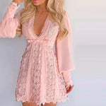 Vestido mini de manga larga para mujer con ribete de encaje y escote en V profundo