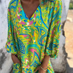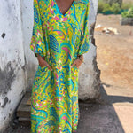 Este vestido largo bohemio para mujer combina a la perfección comodidad y estilo. Con su estampado vibrante y colorido y su silueta relajada, ofrece un look informal y chic. Con un favorecedor escote en V y prácticos bolsillos laterales , es ideal para días de playa, salidas informales o reuniones de verano.