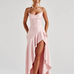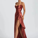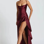 Este vestido largo sin espalda para mujer presenta un escote de tirantes finos , un corpiño ajustado y una abertura alta que realza cada paso. El bajo fluido realza su silueta refinada, ideal para invitadas de boda o para looks de noche sofisticados. Una prenda destacada para un estilo seguro y moderno .