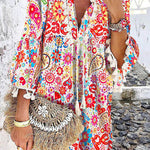 Sumérgete en un vibrante estilo veraniego con este minivestido bohemio floral para mujer , diseñado con un corte holgado y fresco y un llamativo escote con lazo . El divertido dobladillo con borlas y las mangas 3/4 le dan un toque chic y desenfadado. Perfecto para escapadas a la playa o paseos informales de fin de semana.