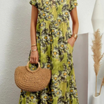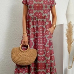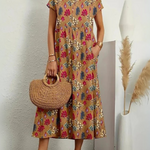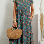 Vestido largo bohemio floral para mujer con mangas cortas y bolsillos laterales