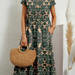 Este vestido largo bohemio y relajado para mujer presenta un encantador estampado floral integral y prácticos bolsillos laterales para el día a día. Sus mangas cortas y su corte fluido lo convierten en la opción perfecta para salidas en climas cálidos. Una prenda básica cómoda y elegante con un aire bohemio y desenfadado.