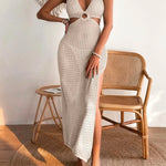 Este vestido maxi de crochet para cubrir el bikini presenta un escote halter y una elegante abertura frontal para lucir espectacular en la piscina o la playa. Su diseño de punto abierto deja ver tu traje de baño, manteniendo un look refinado. Con su abertura lateral y su espalda descubierta , combina comodidad y estilo a la perfección.