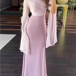 Vestido largo elegante para mujer con corpiño drapeado y mangas acampanadas