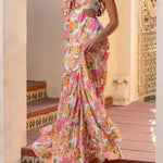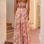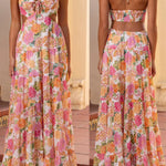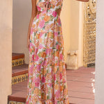 Este vestido maxi floral fluido combina estampados románticos con cortes divertidos para una silueta femenina y desenfadada. El escote con lazo frontal y los cortes laterales le dan el toque perfecto de encanto moderno . Perfecto para vacaciones , brunchs o paseos soleados.