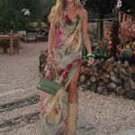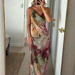 Este impresionante vestido maxi floral presenta un escote halter y una silueta relajada para una elegancia natural. El llamativo estampado floral le aporta encanto y vitalidad, haciéndolo perfecto para días de playa, brunchs o tardes de verano. Diseñado para fluir con naturalidad a cada paso, es una prenda imprescindible para el verano.