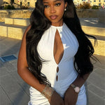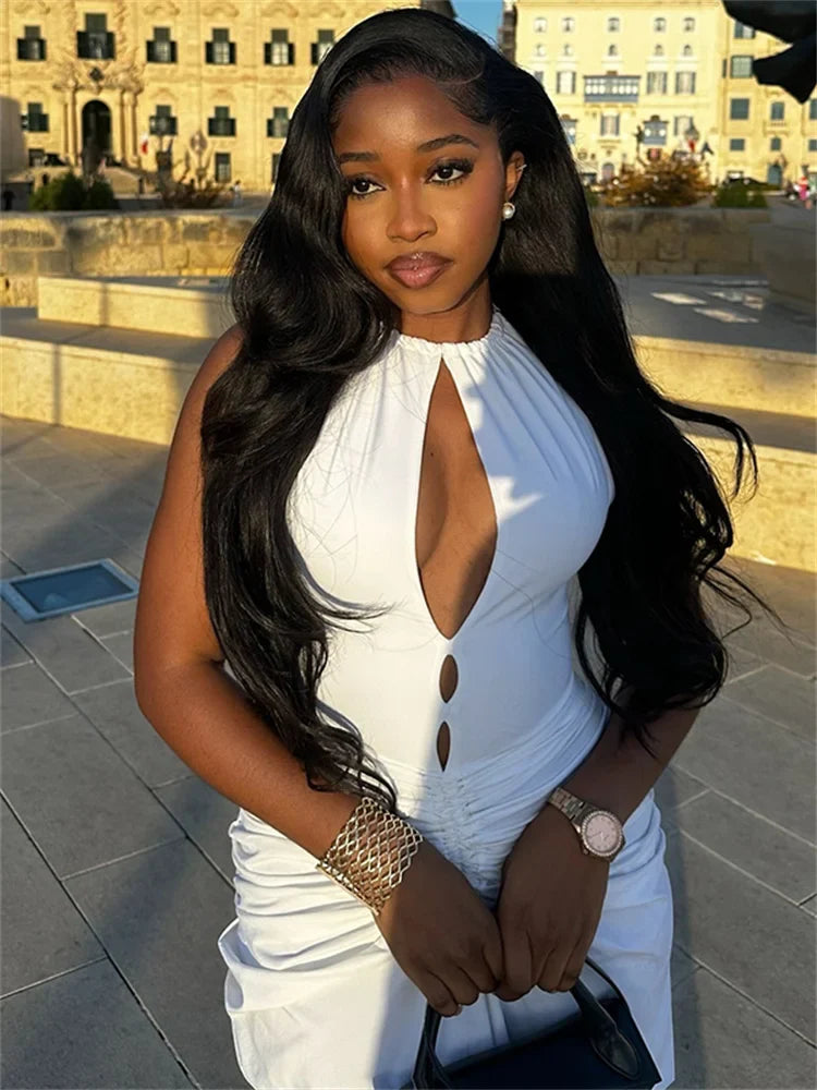Este impresionante vestido maxi halter presenta una silueta elegante y atrevidos cortes frontales que le aportan el toque perfecto. Los detalles fruncidos en la cintura realzan la figura, mientras que el dobladillo largo aporta un elegante equilibrio . Es un look sofisticado y a la vez impactante, perfecto para eventos veraniegos de alto nivel.