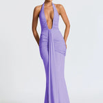 Este vestido maxi halter ajustado presenta un escote en V pronunciado y una cintura fruncida que define la silueta. El drapeado hasta el suelo realza el movimiento y le aporta un toque refinado y audaz. Ideal para noches de verano espectaculares y ocasiones formales .