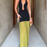 Vestido largo con cuello halter y falda transparente en contraste para mujer