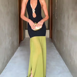 Este vestido largo para mujer, con cuello halter y falda transparente en contraste, combina un diseño impactante con un encanto sutil. Con un escote profundo con detalle de ojo de cerradura y un corpiño ajustado , se transforma en una parte inferior ligera y transparente que aporta un movimiento elegante. Una prenda destacada para ocasiones nocturnas o eventos de verano.
