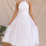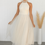 Llama la atención en cada ocasión con este elegante vestido halter de tul.