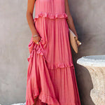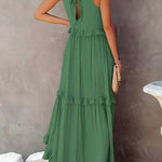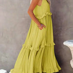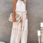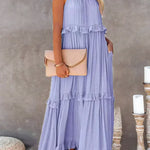 Vestido largo de mujer con cuello halter, capas de volantes y bolsillos laterales