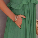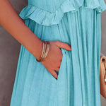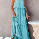 Elegancia fresca en un vestido largo fluido con cuello halter y volantes