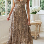 Este impresionante vestido largo con estampado de leopardo para mujer presenta un favorecedor escote en V y tirantes finos ajustables que le dan una silueta femenina. Con un corte holgado y bajo con volantes , se mueve con gracia a cada paso. Ideal para reuniones informales o eventos al aire libre, este vestido es elegante y con un estilo natural.