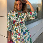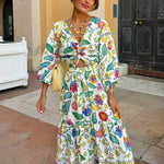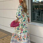 Este vestido largo para mujer presenta un llamativo delantero con vuelta y un favorecedor escote en V que realza su silueta femenina . Las mangas largas abullonadas y el vibrante estampado floral le dan un toque bohemio y desenfadado. Perfecto para vacaciones o salidas informales , ofrece una comodidad fluida con un estilo que destaca.