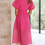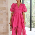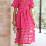 Acapara todas las miradas con este vestido largo , alegre y refinado, con una superposición de rejilla transparente y un escote en V estructurado . Las mangas abullonadas y la cintura ajustada crean una silueta elegante , mientras que el detalle de botones le da un toque clásico . Perfecto para brunchs o eventos en el jardín, este vestido combina encanto y estilo moderno .