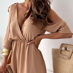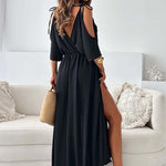 Dale un toque de distinción a tu armario con este impresionante vestido largo con un frente cruzado y drapeado y una sensual abertura lateral . Diseñado para una libertad de movimiento elegante y una feminidad moderna, es perfecto para cenas, vacaciones o veladas especiales. La cintura ceñida y las mangas con hombros al descubierto le dan un toque relajado y sofisticado.