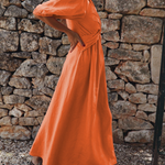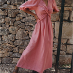 Vestido largo de mujer con escote en V y cintura con nudo torcido