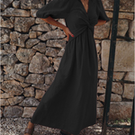 Este vestido largo para mujer combina un estilo moderno con una elegancia atemporal, con una cintura con nudo torcido y un favorecedor escote en V. Las mangas cortas abullonadas le dan un toque elegante, ideal para la transición del día a la noche. Su silueta fluida garantiza comodidad a la vez que mantiene un aspecto elegante y seguro.