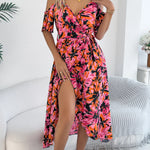 Vestido largo cruzado con hombros descubiertos y estampado floral para mujer, con cinturón y abertura lateral