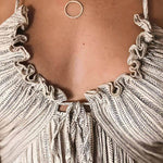 - Ribete de volantes : añade un toque suave y romántico al escote.