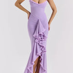 Este vestido maxi ajustado con volantes para mujer presenta una silueta ceñida con escote corazón , delicados tirantes finos y un bajo asimétrico en cascada que se mueve con gracia. Ideal como vestido de invitada de boda o como una opción destacada para una noche de fiesta, combina feminidad con detalles impactantes. Una opción perfecta para ocasiones festivas y eventos de verano.