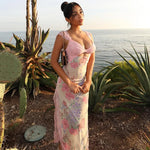 Este vestido largo sin mangas de encaje floral está diseñado para realzar tu silueta con un escote profundo y un corte ceñido. La abertura lateral le da un toque de encanto, haciéndolo perfecto para paseos de vacaciones o eventos nocturnos cálidos. El delicado ribete de encaje y el diseño floral le aportan un encanto romántico y femenino.