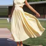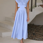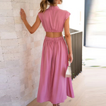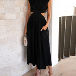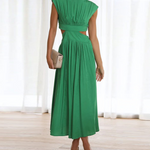 Este vestido midi sin mangas para mujer presenta un elegante cuello alto y una silueta plisada , perfecto para cualquier salida semiformal o elegante . Los detalles en la cintura le aportan un toque moderno y refinado. Su suave caída y largo midi ofrecen una elegancia natural a cada paso.