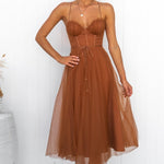 Este vestido largo de tirantes finos presenta un escote corazón estructurado y una ligera capa transparente que le da un efecto femenino y de ensueño. El corte en A y la cintura con lazo realzan la silueta, lo que lo convierte en la opción perfecta para fiestas, veladas o eventos especiales.