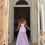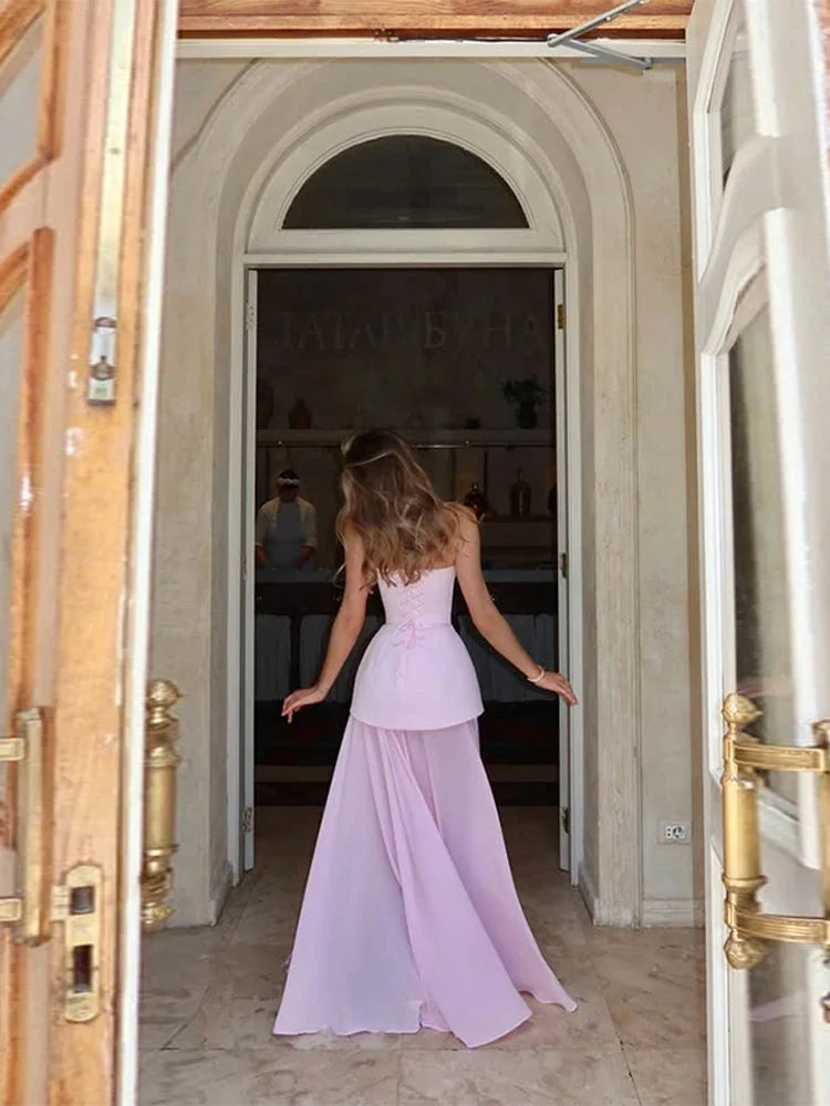 Este elegante vestido maxi sin tirantes presenta un corpiño esculpido estilo corsé que realza tu figura con estructura y encanto. La falda fluida y la pronunciada abertura alta aportan movimiento y confianza para eventos formales o bodas . Un detalle de peplum en capas en la cintura completa el look con sofisticación.