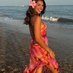 Captura la esencia del verano con este impresionante vestido largo con estampado tropical, ideal para paseos junto al mar y escapadas al sol. Con vibrantes estampados florales y una abertura lateral fresca , este vestido es a la vez alegre y desenfadado . Los delicados tirantes finos completan este look ligero y femenino .