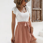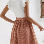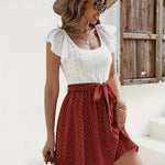 Este minivestido bicolor para mujer combina el encanto clásico con la elegancia informal. El top con ojales detallados aporta textura y feminidad, mientras que la falda acampanada con lazo a juego crea una silueta equilibrada. Ideal para paseos, reuniones o días de playa, es una prenda imprescindible para un estilo desenfadado.